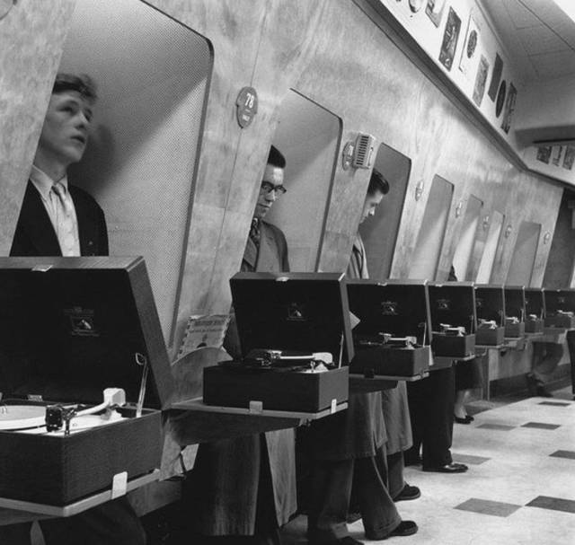 1955年 伦敦唱片店里顾客在隔音间里试听唱片 感觉都可以赶上现在的vip服务了。