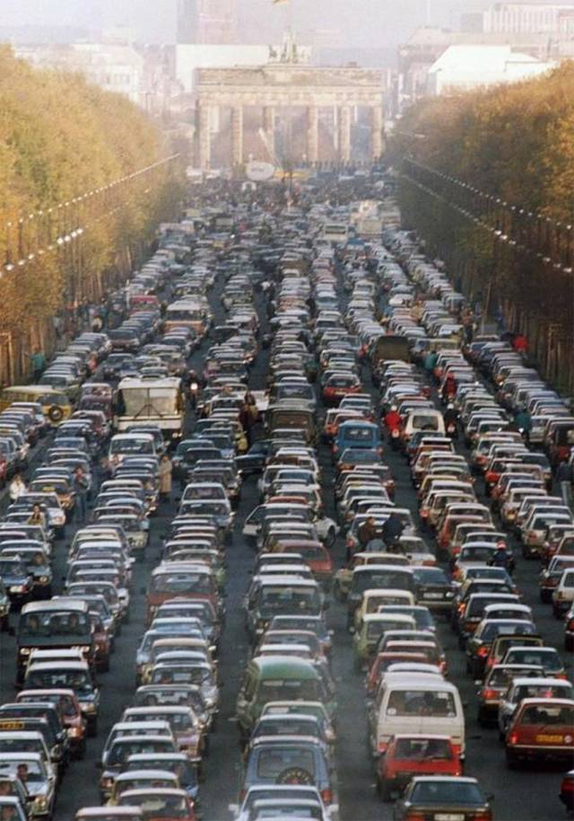 1989年11月 柏林墙倒下后的第一个周六 大量东柏林人开车进入西柏林