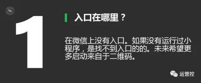 小程序在微信里是没有入口的,很多人看到微信开始内测小程序,大家说这是一个新的机会,我们应该第一波上去,去获得一些流量上的红利,但是那就非常遗憾,公众号在微信里面其实也没有入口,一个用户如果没有订阅过任何一个公众号,他在微信里面找不到这样一个入口,小程序也是一样的,如果一个人没有去运行过任何一个小程序,他在微信里也是找不到小程序的入口。