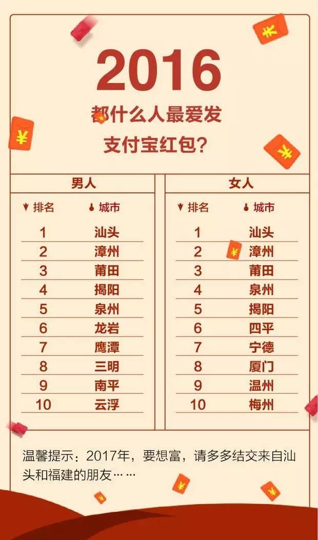 2016年,在发红包排行榜上,广东汕头人最豪爽,第二名是2015年夺冠的福建漳州人民,接着是福建莆田,前三名城市人均发红包金额都超过5000元。