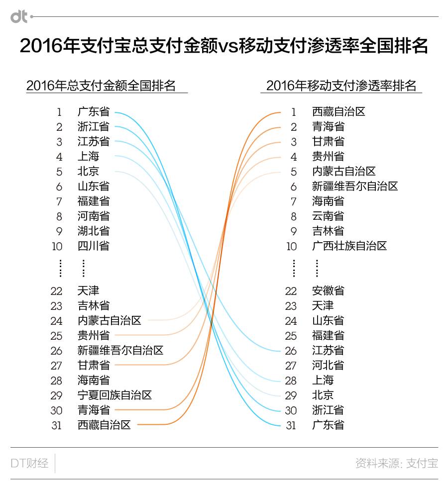 DT君发现,中国大陆31个省(市)2016年的总支付金额排名,和移动支付笔数占比(即移动支付渗透率)排名基本上掉了个个儿: