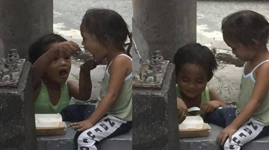 国外网友Geo Tolentino Ringor在和丈夫去餐厅时看到一个独自乞讨的小男孩,就顺便给他买了一份餐。而当他们离开餐厅时,看到了这样的一幕:小男孩很认真地喂着妹妹吃饭。