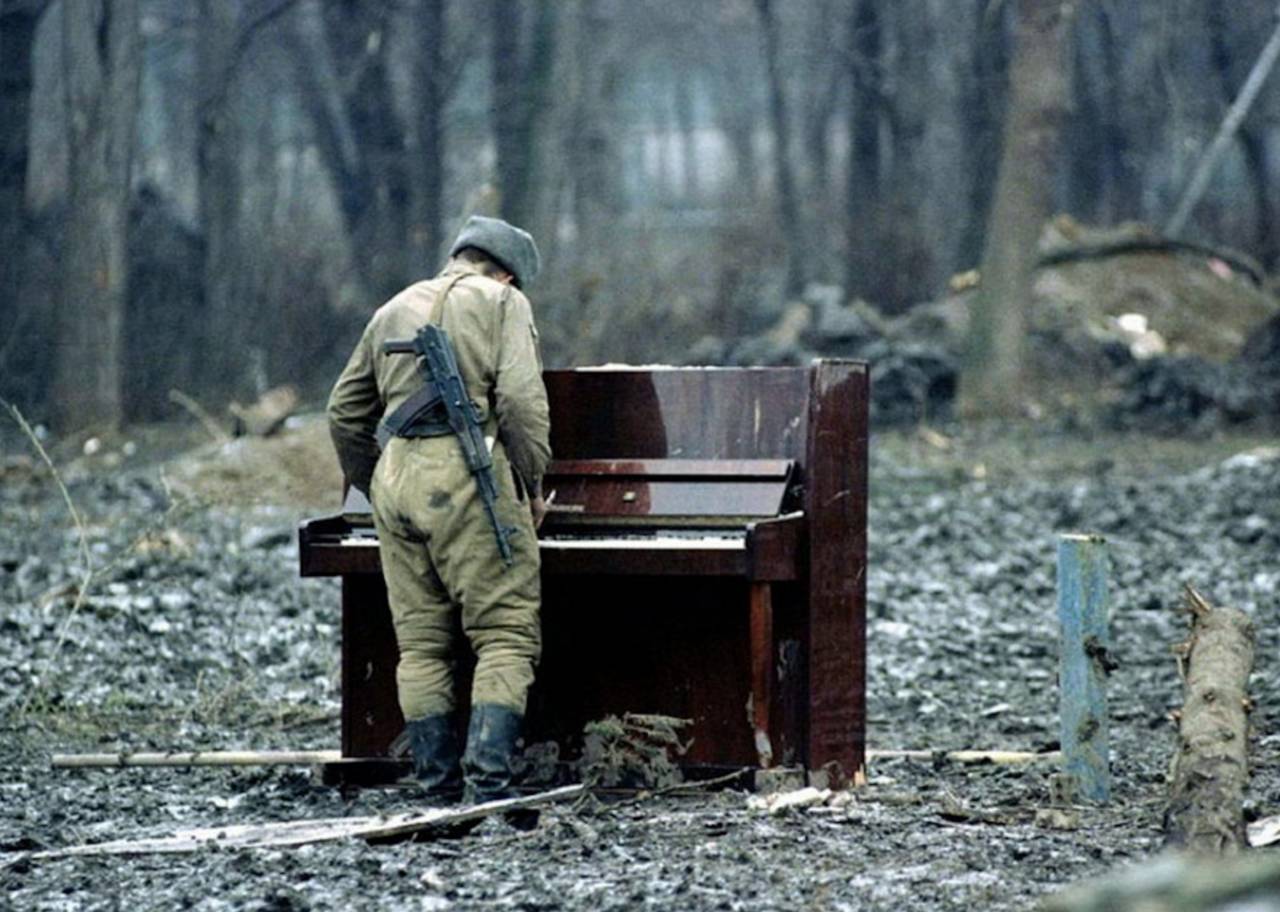 1994 年,一名俄罗斯士兵在车臣弹奏一架废弃了的钢琴。