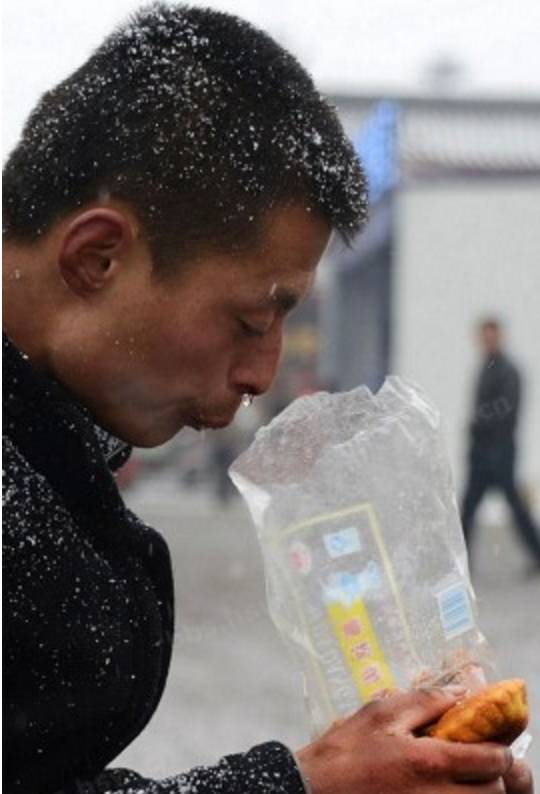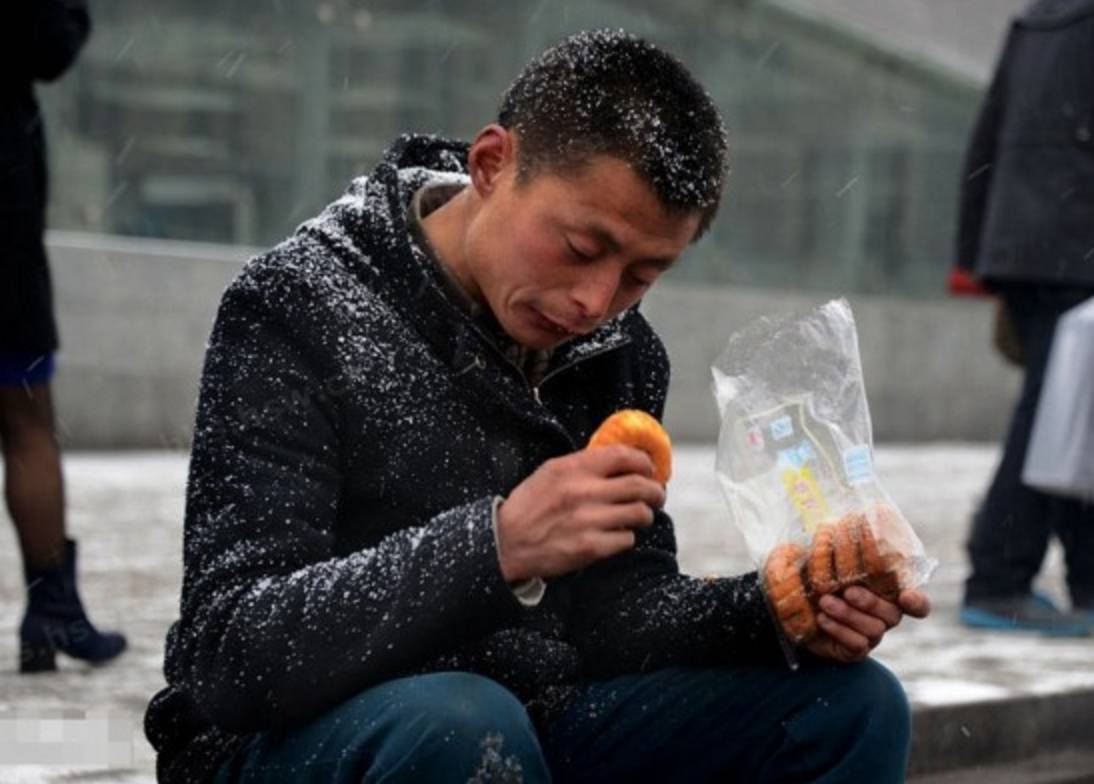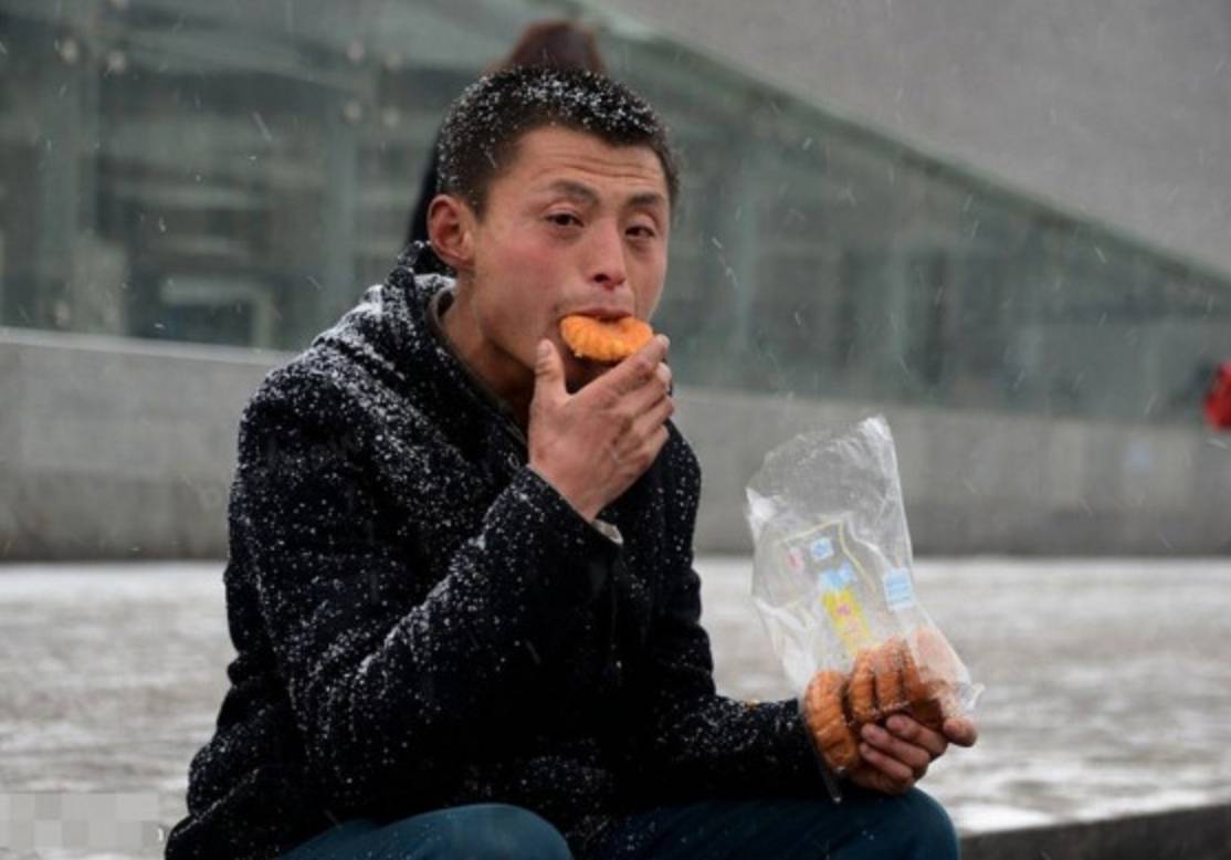 2014年,西安火车站,一位农民工兄弟顶风冒雪坐在铸铁老虎车等生意。他脸色蜡黄直流鼻涕,偶尔哆嗦一下,大口地吃着蛋糕。想是患感冒了,为了谋生,不得不节省吃饭时间,等在雪地里拉生意。