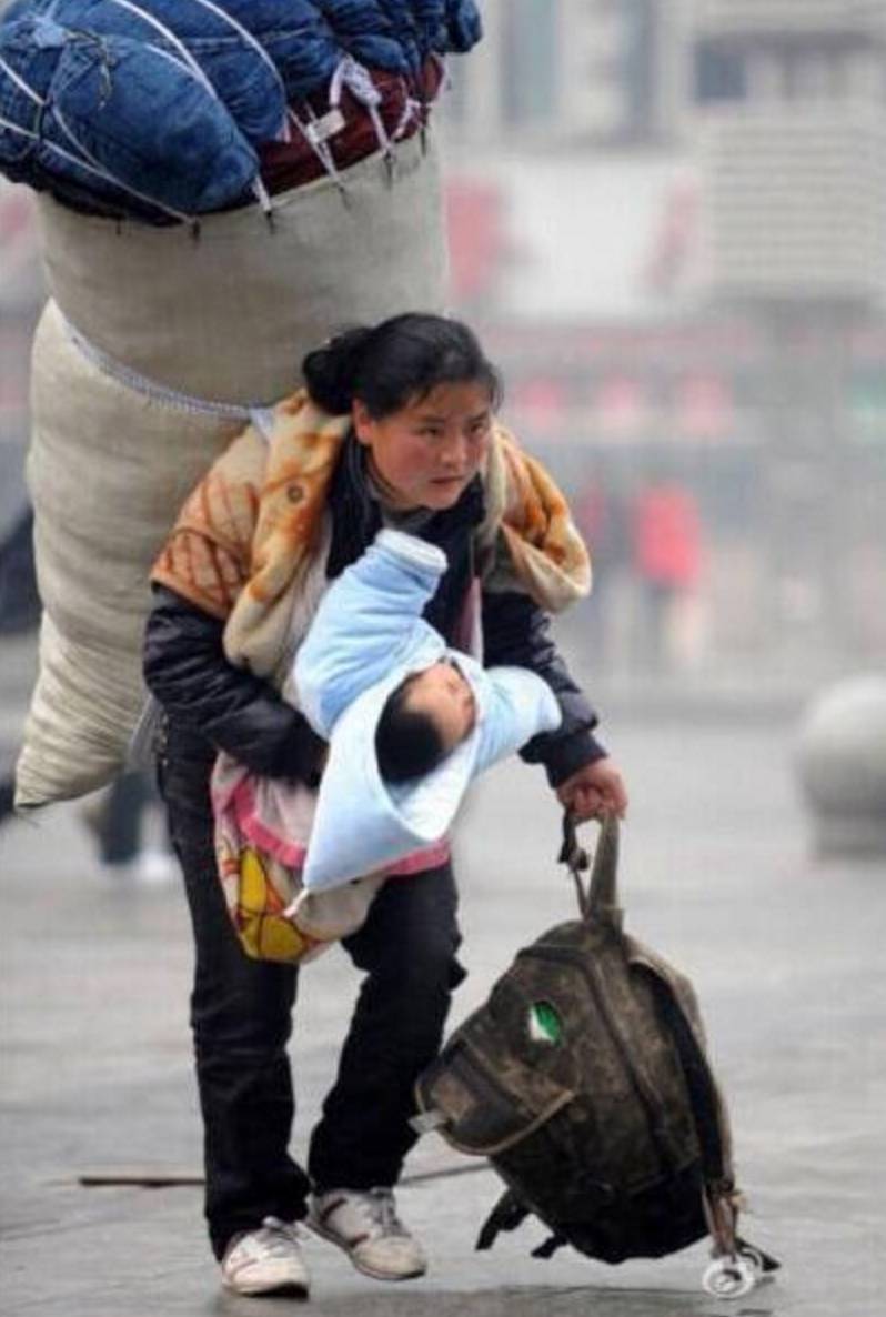 2010年1月30日,江西南昌火车站,一位背负着超大行李的母亲怀抱孩子匆忙赶车,准备回家过年。