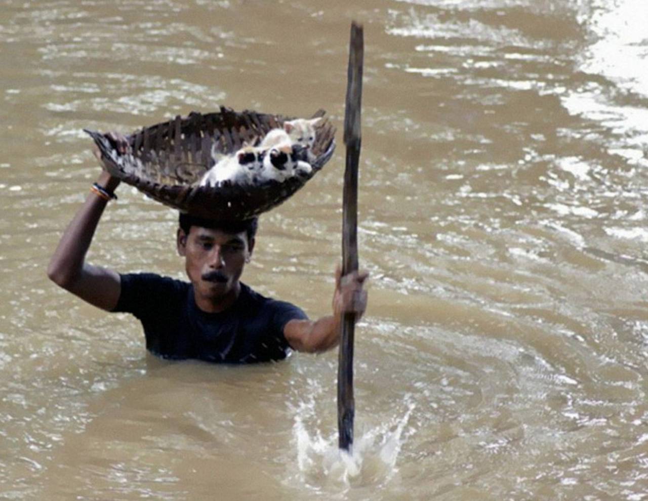 在2011年印度克塔克市一场水灾中,英勇的村民靠着头上的一个篮子,拯救了许多流浪猫。