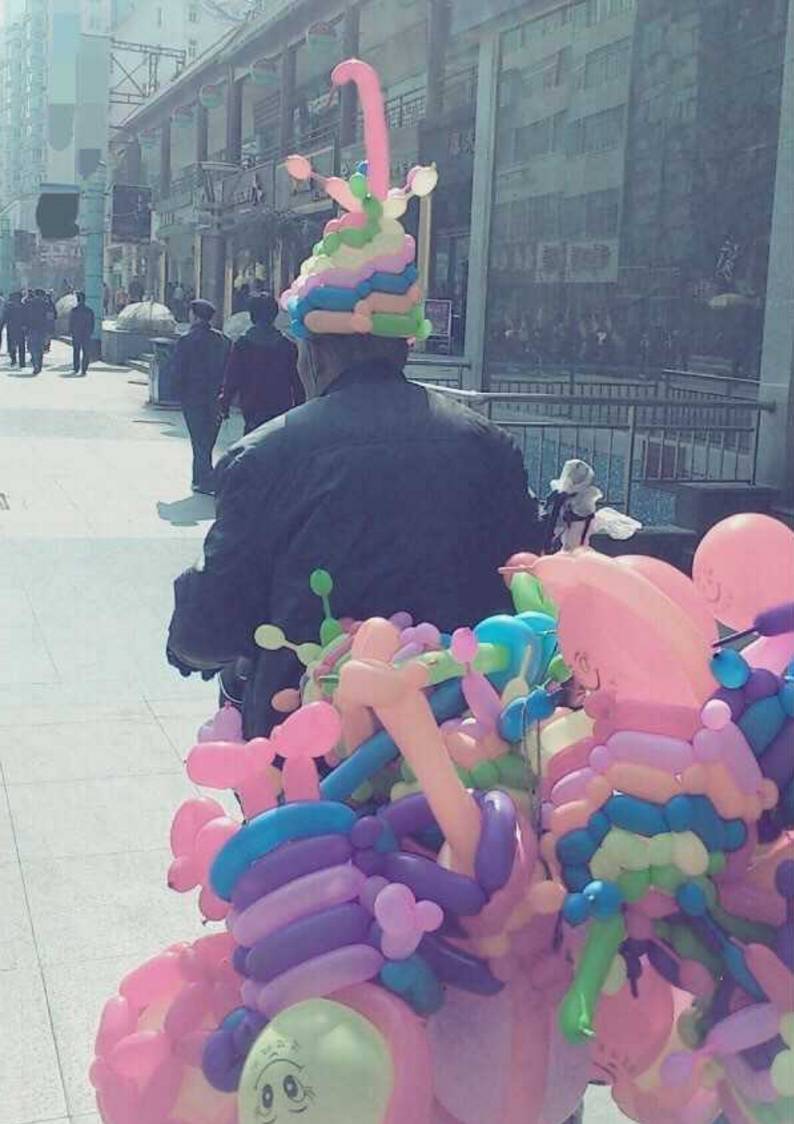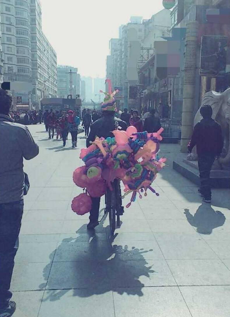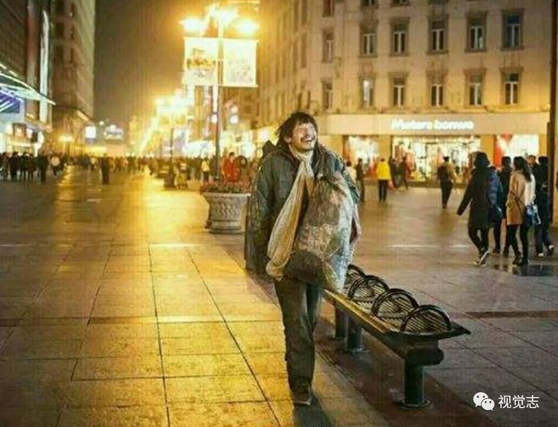 2012年,正月十五,一个流浪汉开心地走在繁华的步行街头。