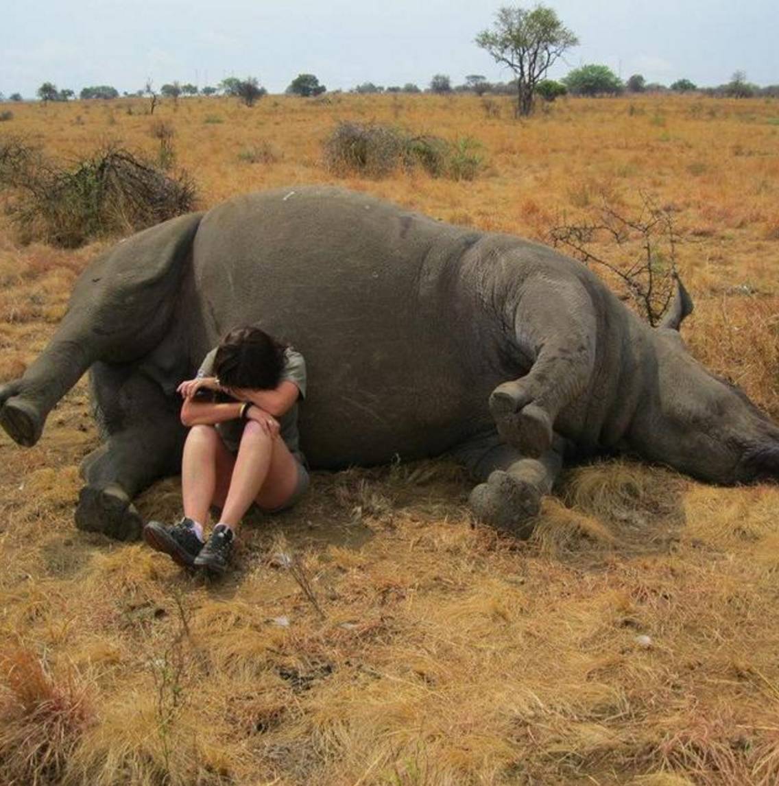 无力救援,野生动物工作者在死去的犀牛旁边哭泣。