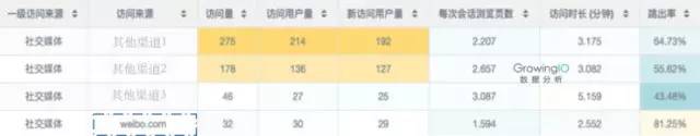 以GrowingIO的博客为例,这是一个内容运营的子站,上面有很多数据分析和增长黑客的文章。我们通过访问来源分析发现,相比于其他渠道,从微博过来的用户数量和质量都偏低。在运营资源有限的情况下,我们可以重新规划一下媒体推广的策略,把精力放到高质量渠道上。
