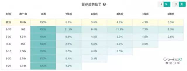上图展示的留存图,横向比较展示了每周新增用户在后续各周的留存率,竖向比较展示了不同周的新用户在今后一段时间的留存表现。