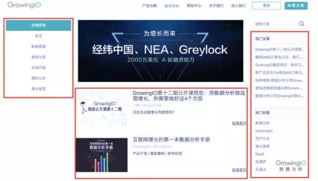 以GrowingIO 的技术博客为例,该博客属于PGC模式。博客中的内容有不同分类,为了降低用户获取信息的成本,我们在博客首页设计了不同板块的入口,包括左侧分类导航、中部文章推荐和右侧热点推荐。
