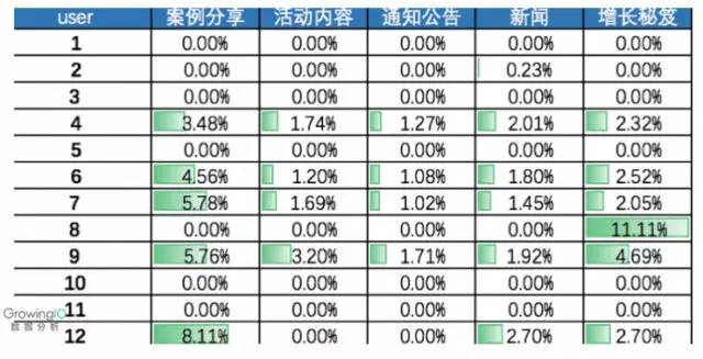 同样以GrowingIO的博客为例,我们通过对访问用户的文章点击情况进行统计,得到了上述表格的结果。显然,用户8对”增长秘籍“有着自己的偏好,用户6、7、9对”案例分享“文章更青睐。那么在实际的内容推送中,我们可以对用户8推送增长秘籍类文章,向用户679推送案例分析的文章,其他用户无差别推送。