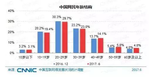 根据中国互联网络信息中心(CNNIC)在2017年8月发布的第40次《中国互联网络发展状况统计报告》,中国网民以10-39岁群体为主,占整体的72.1%:其中20-29岁年龄段的网民占比最高,达29.7%。