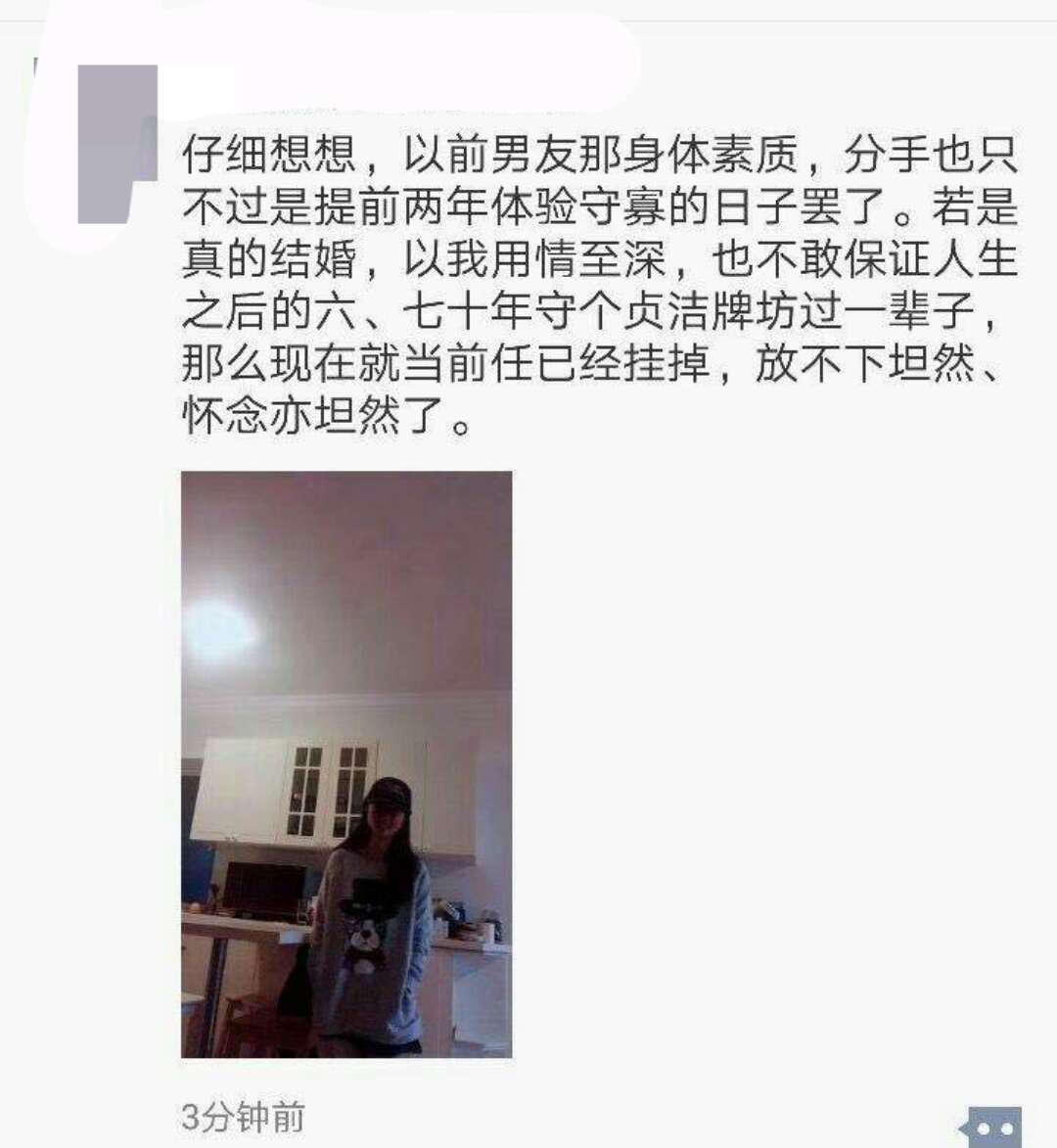 而对她前男友,她正是直接在朋友圈说别人那方面不行,当前任已经挂掉,这样的恶毒就是纯粹的缺乏善良。