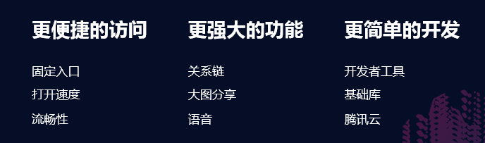 小游戏全面兼容和支持H5游戏,未来将面向企业开发者和个人开发者开放。小游戏也将作为H5游戏升级的平台,提供更便捷的访问入口,更强大的功能模块,与更简单的开发流程,展现去中心化、有规则、依靠关系链的游戏开放生态,为开发者提供更丰饶的发展土壤——