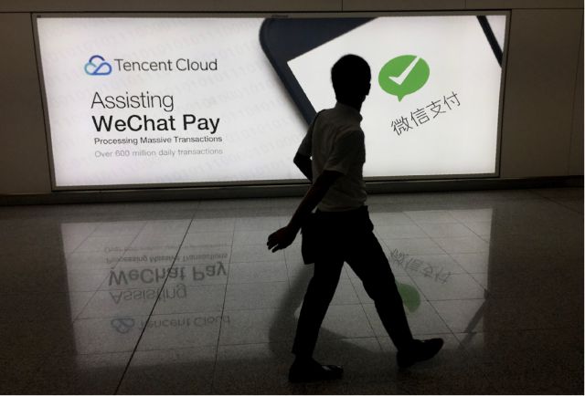 香港国际机场,一名男士经过微信社交媒体平台的广告。摄:Richard A. Brooks/AFP/Getty Images