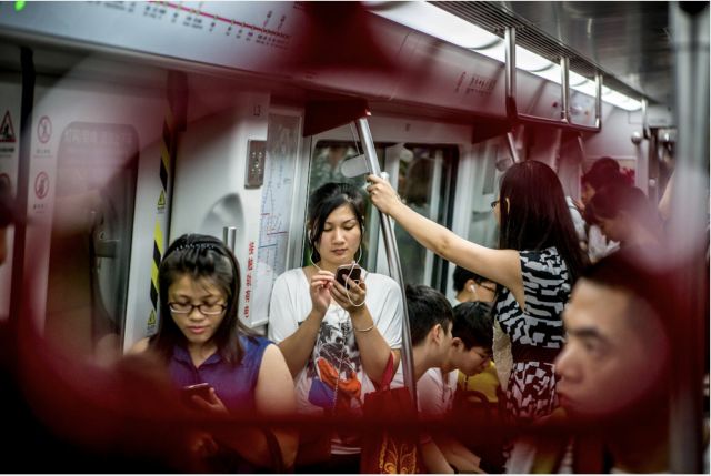 微信月活跃用户趋向10亿量级,已接近全社会阶层的复杂度。图为广州地铁上,大多数乘客都观看手机。摄:Imagine China