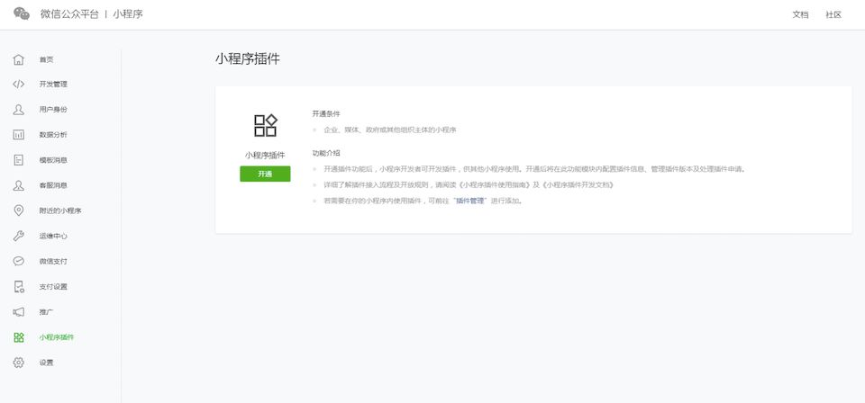小程序开发者无需重新注册帐号,简单几步就能直接在小程序管理后台开通插件功能——