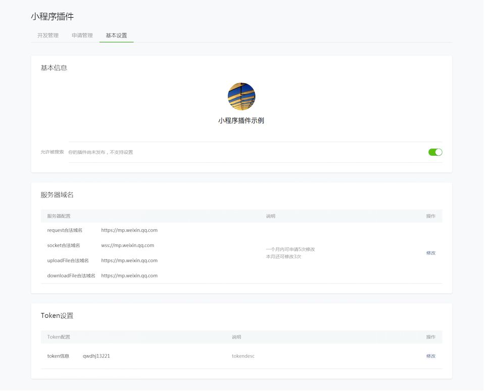 ③ 设置插件的服务器域名及Token信息后,即可开发插件。详见《小程序插件接入指南》、《小程序插件开发文档》;