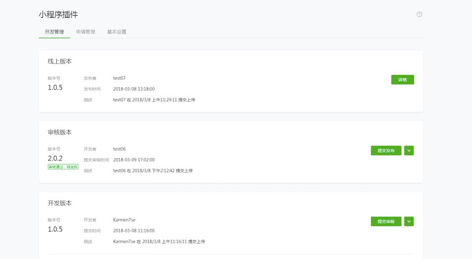“申请”通过后,小程序开发者就能使用该插件了。详见《小程序插件开发文档》
