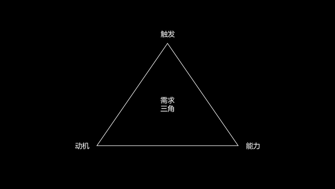 按照福格行为模型B=MAT理论来看,一个人必须要同时满足这三点才会有所行动,其中B是Behavior行为,M是Motivation 动机,A是Ability能力,T是Triggers触发,我姑且称之为需求三角吧。