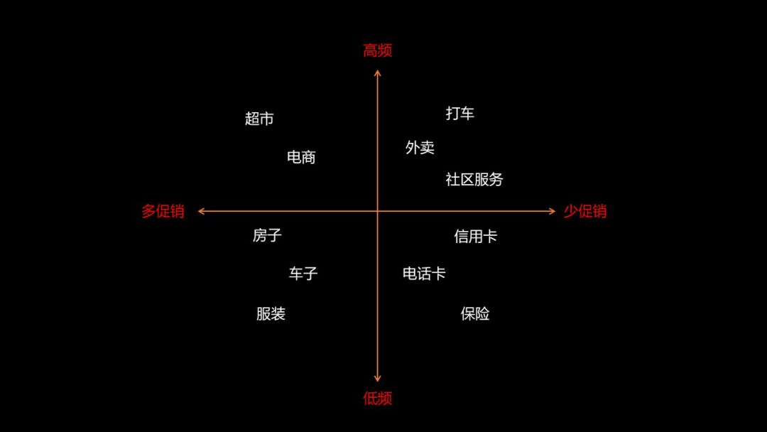 用户终生价值高:右下角低频场景中的信用卡、保险、电话卡等,这些产品最大的一个特点就是用户的终身价值非常高,只要用户使用上了产品,出于惯性使然,后面更换的几率基本不大,所以此类产品刚开始使用多大的促销方式获取用户都不为过。