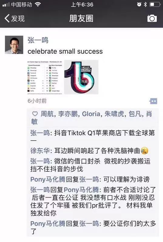 今天凌晨,今日头条创始人兼CEO张一鸣发布了一条朋友圈,内容是“celebrate small success”(意为“庆祝一个小小的成就”),他所说的是抖音Tik tok在第一季度的苹果商店下载榜中排名全球第一。