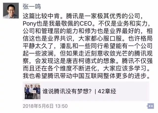 就在刚刚过去的周末,一篇《腾讯没有梦想》的文章刷屏,引发了一场对腾讯价值观以及信仰的舆论风波,张一鸣转发了《谁说腾讯没有梦想》的文章力挺腾讯和马化腾。