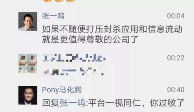 但也有爆料称,张一鸣在其这篇文章下面留言表示:“如果(腾讯)不随便打压封杀应用和信息流动,就是更值得尊敬的公司了。”马化腾则回复张一鸣“过敏了”,表示“平台一视同仁”。