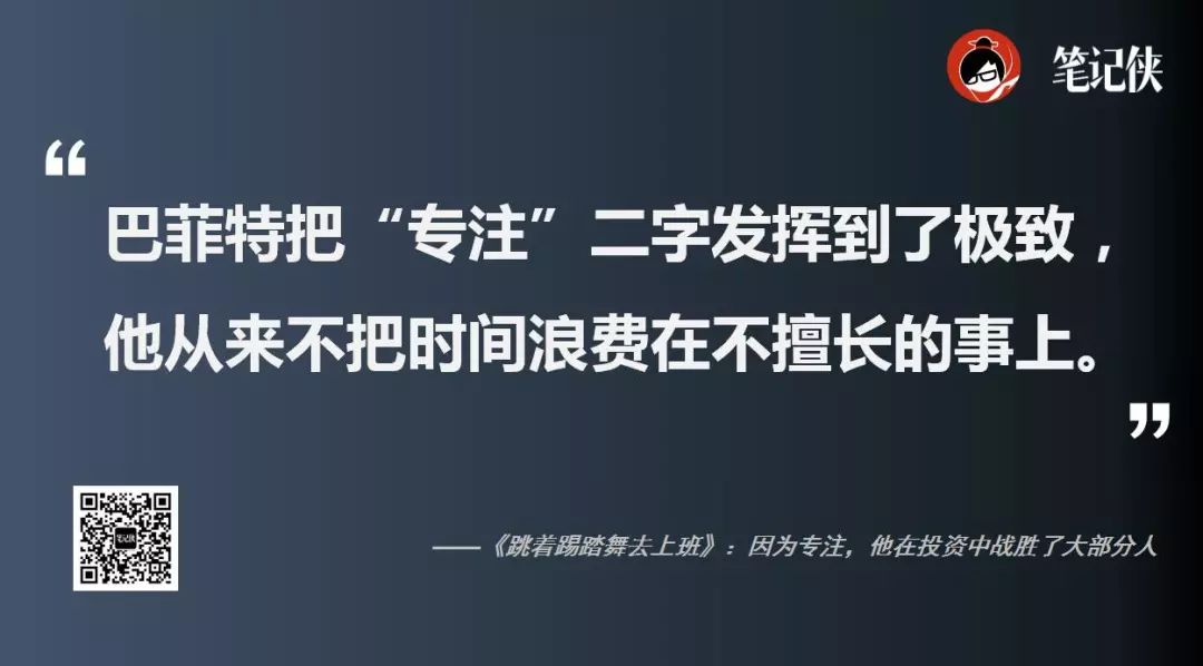 巴菲特把“专注”二字发挥到了极致,他从来不把时间浪费在不擅长的事上,艺术、烹饪等等他都不在意,而只是专注一件事,恰好这件事赚钱了而已。