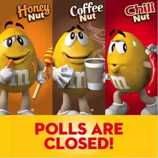 他们发起一场投票,让消费者在蜂蜜坚果、咖啡坚果和辣坚果的花生巧克力豆中做出选择,最后咖啡味胜出,成为M&M’s的常规口味。