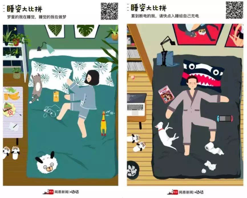 而网易新闻的刷屏H5《睡姿大比拼》,则将“微标签”图像化,通过足够多样化的组成部件,让用户可以生成自己专属的“睡姿”和“生活图景”。
