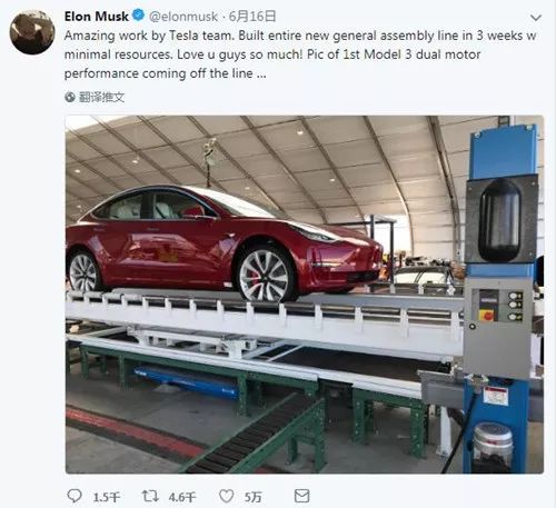 马斯克在其推特中表示,特斯拉团队在 3 周内建成了一条新的 Model 3 装配线,并公布了首辆双电机性能版 Model 3,其为四轮驱动,续航里程约499公里,加速到约 96.6公里的时速所需时间为 3.5 秒,最高时速可以达到约 250 公里每小时。