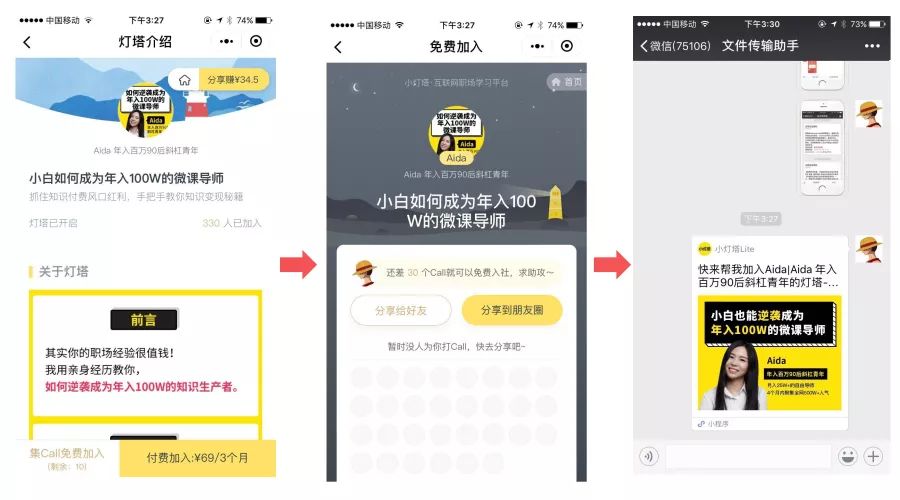 这类小程序的裂变增长和公众号任务裂变思路是一致的,通过课程或奖品作为吸引点,引导用户分享号召用户助力,达成固定人数助力,即可免费领取课程/获得奖品。其中以知识付费类产品小灯塔做得尤为出众: