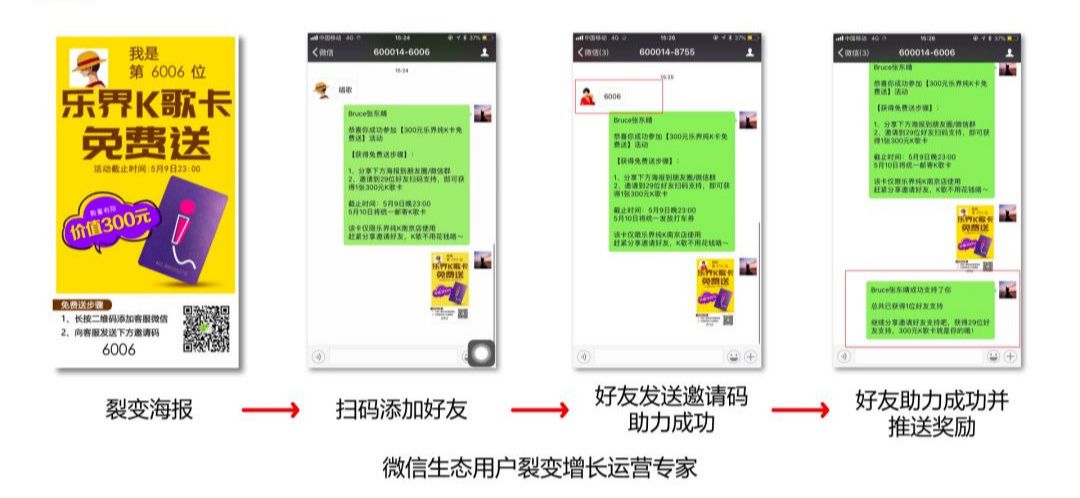 在玩法上和订阅号裂变的逻辑一样,都需要一张裂变海报去传播。只不过,用户识别裂变海报上的二维码是添加客服号,用户之间的助力关系是通过向客服号发送数字码而产生关联关系。这种方法既能够保证用户新增到个人客服号上,又能够实时反馈给用户最新裂变活动进度,效果极佳。