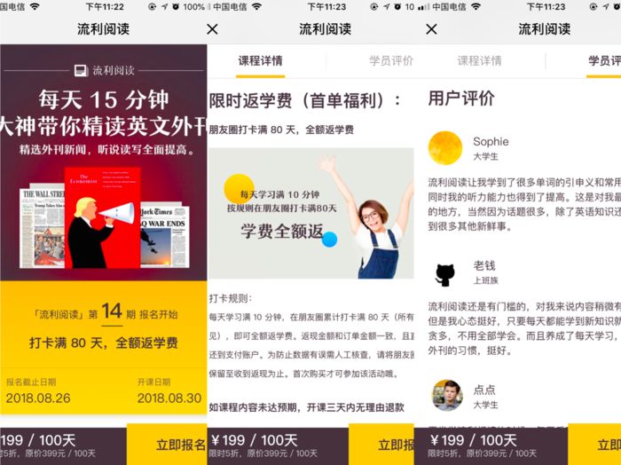 而有些打卡类裂变活动,则把承诺这个要素放在了产品设计里,比如承诺打卡满多少天退还学费,打卡坚持多长时间瓜分现金等。