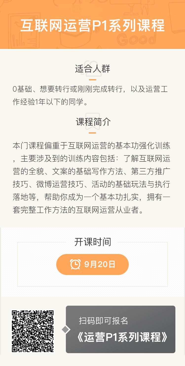 这门曾帮近6000多人成功入门/转行互联网运营的运营P1系列课程,即将于后天(9月20日)开课!目前仅剩最后不到30个名额!走过路过不能错过,想要抢座的同学赶快扫描下方海报中的二维码前去报名吧!